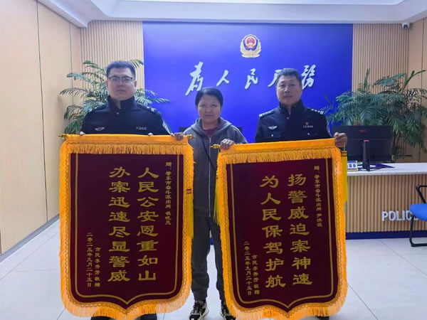 為表達(dá)對奮斗派出所民警、輔警的感激之情, 10 月 10 日,李女士特意制作了兩面寫有 “人民公安恩重如山,辦案迅速盡顯警威”“揚警威破案神速,為人民保駕護航” 的錦旗,專程送到奮斗派出所,親手交到民警尹洪波和輔警崔曉亮手中,用最樸實的方式向守護群眾財產(chǎn)安全的人民警察致敬。