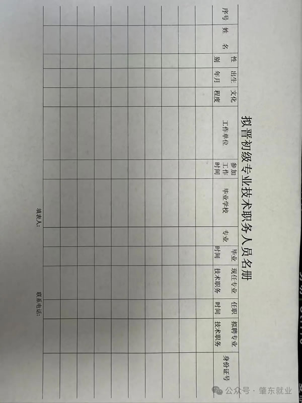 4、填寫《擬晉初級專業(yè)技術(shù)職務人員名冊》一份,內(nèi)容填全。