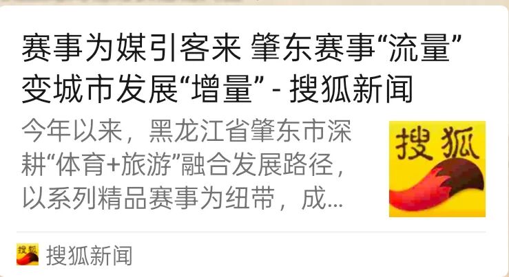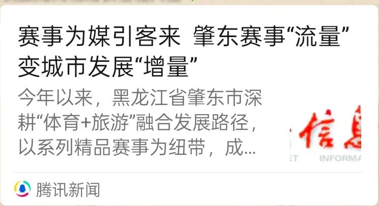 近日,肇東市以系列精品賽事為核心的文體旅融合發(fā)展模式引發(fā)多家媒體集中關(guān)注,今日頭條、騰訊新聞、搜狐新聞、百度、市場(chǎng)信息報(bào)信息快訊等多家媒體相繼聚焦其賽事經(jīng)濟(jì)成效進(jìn)行專題報(bào)道,讓肇東“以賽促游、以游興城”的發(fā)展故事成為矚目焦點(diǎn),賽事經(jīng)" />