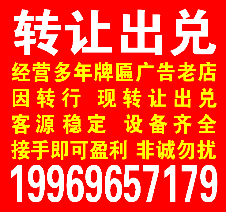 經(jīng)營(yíng)多年牌匾店廣告老店因轉(zhuǎn)行,現(xiàn)出兌,客源穩(wěn)定,設(shè)備齊全,接手即可盈利,非誠(chéng)勿擾。