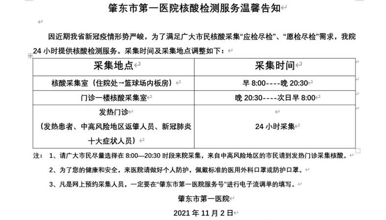 因近期我省新冠疫情形勢嚴峻,為了滿足廣大市民核酸采集“應檢盡檢”、“愿檢盡檢”需求,我院24小時提供核酸檢測服務。采集時間及采集地點調整如下: