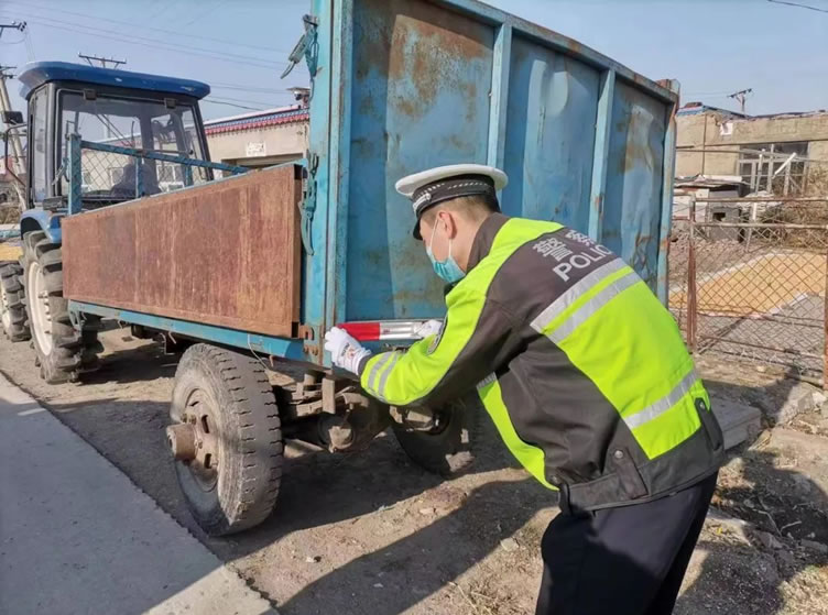 行動同時,交警為沒有反光標識的農用車粘貼了反光貼,對已陳舊、脫落的進行查缺補漏,消除盲區(qū)和死角,夯實“亮尾工程”,為秋收保駕護航。