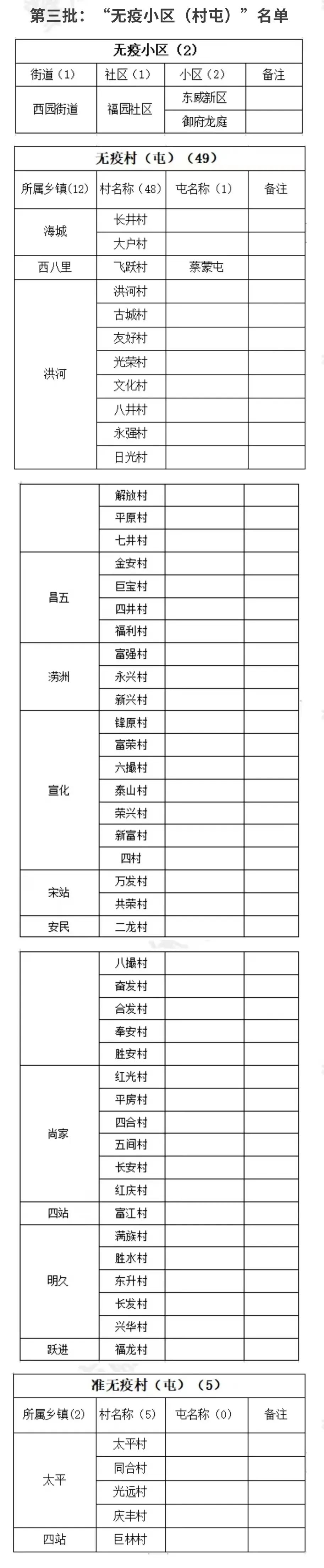 根據(jù)《肇東市“無疫小區(qū)(村屯)”創(chuàng)建工作方案(試行)》,經(jīng)肇東市各社區(qū)(村)申報(bào)、街道(鄉(xiāng)鎮(zhèn))審核,市專家組審定,第三批確定2個(gè)小區(qū)為“無疫小區(qū)”、49個(gè)“無疫村(屯)”、5個(gè)“準(zhǔn)無疫村(屯)”。