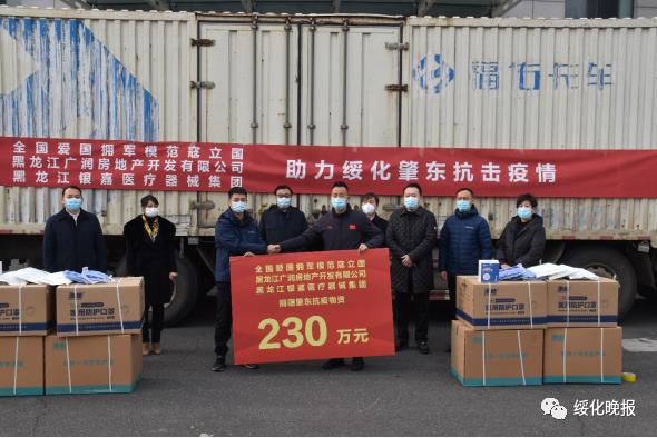 11月24日,正值肇東市抗擊新冠疫情關(guān)鍵時(shí)刻,肇東籍企業(yè)家、立國集團(tuán)董事局主席寇立國,攜手黑龍江銀嘉醫(yī)療器械集團(tuán)董事長朱宏偉、黑龍江廣潤房地產(chǎn)開發(fā)有限公司董事長馬麗,向肇東市捐贈總價(jià)值230萬元的防疫物資。
