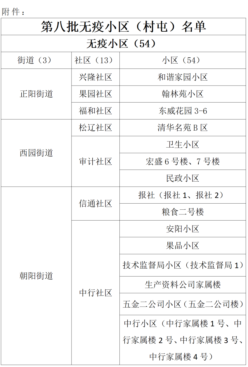 第八批確定無疫小區(qū)(村屯)共62個(gè),其中54個(gè)無疫小區(qū)、7個(gè)準(zhǔn)無疫小區(qū)、1個(gè)無疫村。