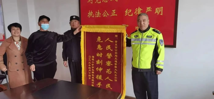 “謝謝,真是太感謝警察同志了!”第二天學(xué)生家長(zhǎng)袁女士將一面印有“人民警察為人民,危急時(shí)刻顯身手”的錦旗送到肇東市公安局交警大隊(duì)民警岳彩明的手中,對(duì)民警救助孩子表示感謝。