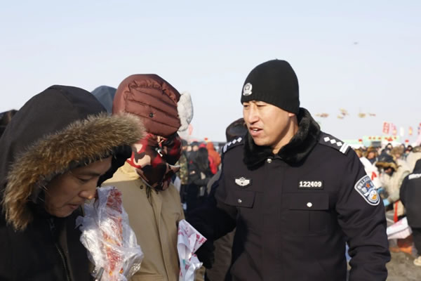 由于捕魚(yú)時(shí)湖面上打下了很多“冰眼”,為了防止群眾距離出魚(yú)口過(guò)近掉入“冰眼”,執(zhí)勤民警合力將“冰眼”守護(hù)起來(lái),疏導(dǎo)圍觀群眾保持安全距離。執(zhí)勤過(guò)程中,民警們不畏嚴(yán)寒、頑強(qiáng)作戰(zhàn),組織、疏導(dǎo)現(xiàn)場(chǎng)群眾有序觀看捕魚(yú),有效防止了意外事故的發(fā)生。