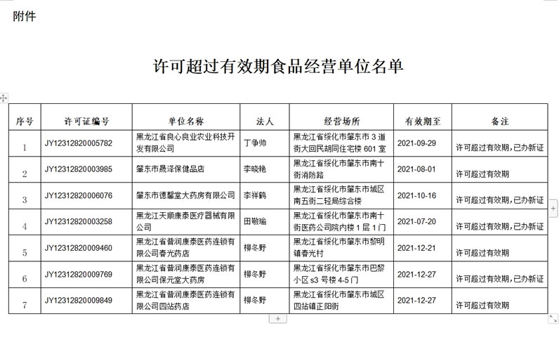 根據(jù)“黑龍江省市場監(jiān)督管理局綜合業(yè)務(wù)管理系統(tǒng)”反饋,我市現(xiàn)有7家食品經(jīng)營許可證已超過有效期的食品經(jīng)營單位。根據(jù)《食品經(jīng)營許可和備案管理辦法》第五章第三十九條 有下列情形之一,原發(fā)證的市場監(jiān)督管理部門應(yīng)當(dāng)依法辦理食品經(jīng)營許可注銷手續(xù):(一)食品經(jīng)營許可有效期屆滿未申請延續(xù)規(guī)定,現(xiàn)對其注銷,現(xiàn)予以公告。
