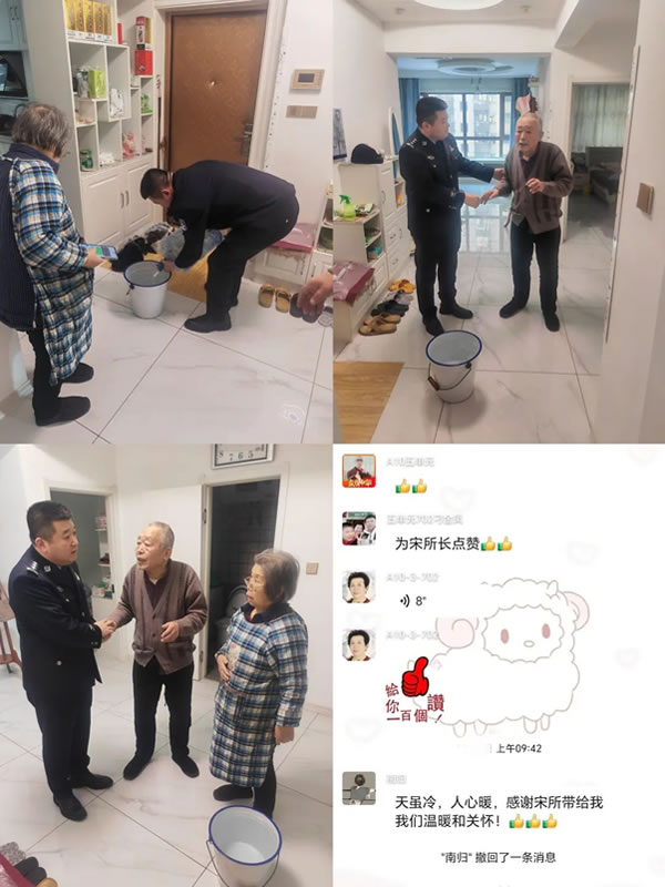 五一假期這天,萬福國際小區(qū)因線路問題,突然停水,A棟3單元的兩位老人剛要做飯,卻發(fā)現(xiàn)停水了,由于年紀大了下樓打水不方便,于是便在網(wǎng)格群里說了一句家里沒有水做不了飯。這一訴求被同在群內(nèi)的奮斗派出所所長宋艷冬看在眼里,于是不到十分鐘便親自把生活用水送到了兩位老人家中,兩位老人激動地拉著宋所長的手,眼里飽含淚光和感激!
