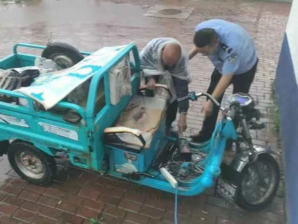 民警發(fā)現(xiàn)求助的是一位殘疾人,車是一輛電動三輪車?吹矫窬,報警的群眾略顯緊張,將事情經過小聲地講給民警等人聽。原來,這位群眾姓遲,受過外傷導致殘疾,平時靠一輛電動小三輪出行。今天早上,遲大哥從澇洲鎮(zhèn)到肇東市區(qū)來溜達,順便想吃點肇東小餅,沒想到趕上下了一天的雨,想回去澇州時電動車就沒電“罷工”了,F(xiàn)在離家里還有好幾十公里路,沒有地方充電了,所以想到這個時候只有人民警察能幫助自己,遲大哥看見巡邏警察趕緊向警察求助。