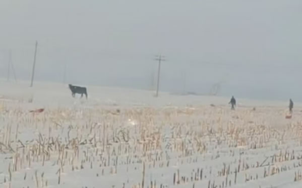 民警了解情況后為了避免瘋牛在村屯里傷害群眾,便立即組織人員開車拿著棒子等工具將瘋牛趕到了屯后的大地里。工作人員幾次試圖靠近瘋牛,但瘋牛看見有人靠近就會向人沖過來,工作人員在幾次奔跑驅(qū)趕中摔倒在了雪地里。工作人員顧不上個人安危,但考慮到采取強(qiáng)攻制服瘋牛的策略勢必會造成人員損傷,經(jīng)過研究準(zhǔn)備采取智取方式制服瘋牛。經(jīng)過近一小時的忙碌后,這時瘋牛的情緒逐漸穩(wěn)定下來了。工作人員見時機(jī)成熟,慢慢的靠近老牛,并快速的拽住韁繩,將牛趕上了車。最后大伙一起將牛送回了李老漢的家中。