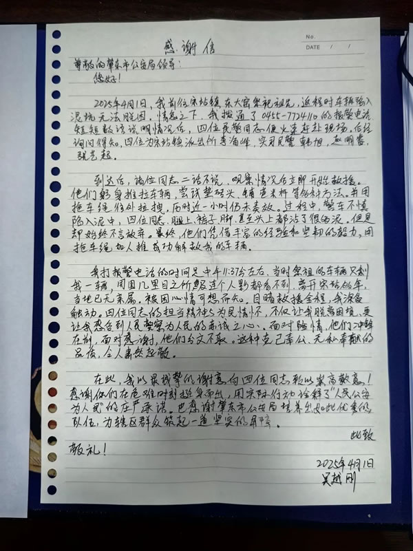 近日,肇東市公安局宋站派出所民警用實際行動書寫了為民服務(wù)的暖心篇章。民警張臨帶領(lǐng)新警張藝超、韓旭、趙明睿,成功幫助一名外地司機(jī)吳先生將陷在泥地里的轎車拖拽出來,讓司機(jī)在困境中感受到了人民警察的關(guān)懷與擔(dān)當(dāng),4月7日,群眾吳先生親自到肇東市公安局為“春苗”民警和宋站派出所民輔警送來感謝信。