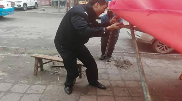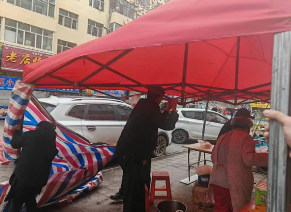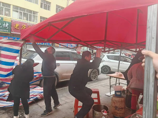 上午,副所長(zhǎng)吳復(fù)生帶領(lǐng)輔警崔曉亮巡邏至花園街一商鋪門口時(shí),發(fā)現(xiàn)其門口用于遮擋其制作油條臺(tái)子的簡(jiǎn)易帳篷在大風(fēng)中劇烈搖晃。此時(shí)老板正在帳篷內(nèi)忙碌制作油條,周圍行人不斷,帳篷一旦被大風(fēng)掀翻,后果不堪設(shè)想。見此危急情況,吳復(fù)生和崔曉亮立即快步上前。他們先安撫緊張的老板,讓其不要慌亂,隨后兩人齊心協(xié)力,在狂風(fēng)中艱難地將帳篷收起。盡管大風(fēng)呼呼作響,吹得他們站立不穩(wěn),但二人始終沒(méi)有放棄。