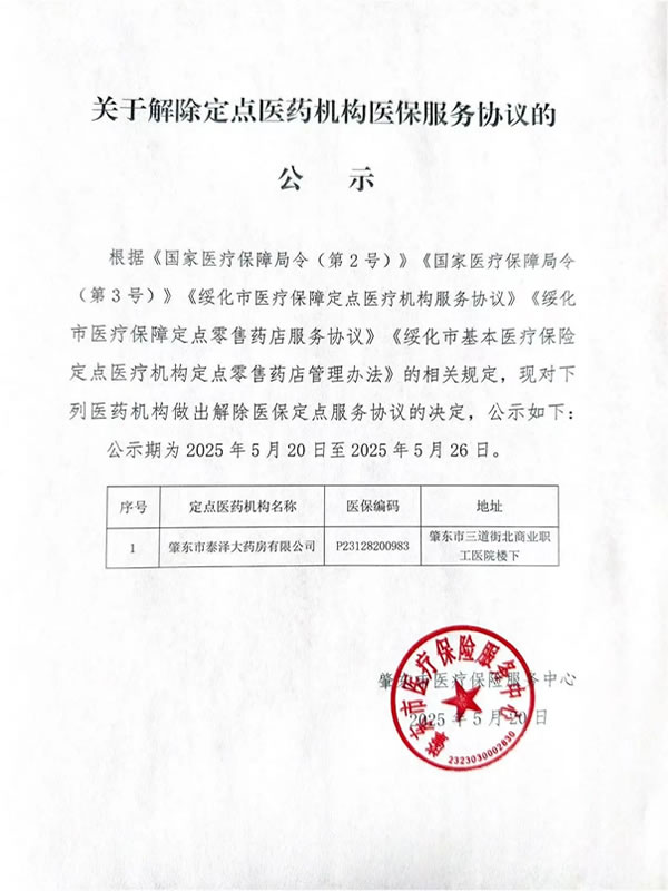 關(guān)于解除定點(diǎn)醫(yī)療保險(xiǎn)醫(yī)保服務(wù)協(xié)議的公示