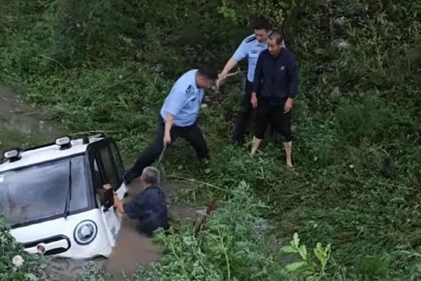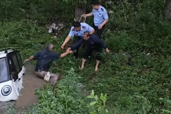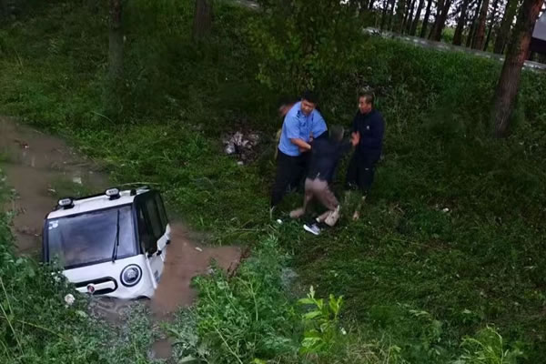 8月2日晚七時(shí)許,狂風(fēng)大雨襲擊了肇東市昌五鎮(zhèn),路面和公路兩側(cè)的坑內(nèi)積水瞬間上漲。此時(shí),從肇東方向駕駛電車回躍進(jìn)鄉(xiāng)的六旬老人劉某,因大雨遮擋視線,再加上路面積水過(guò)深,操作失誤將車輛開進(jìn)了S311省道昌五鎮(zhèn)境內(nèi)的大坑內(nèi)側(cè)翻,駕駛員被車輛困在坑內(nèi)齊腰積水中,無(wú)法脫身。路過(guò)的群眾發(fā)現(xiàn)后立刻報(bào)警,昌五派出所民輔警接警后趕到現(xiàn)場(chǎng)。