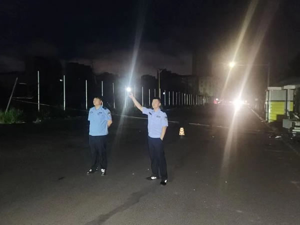 由于該路段照明設(shè)施少,電線桿倒伏位置特殊,現(xiàn)場十分危險,為防止車輛看不見電線而發(fā)生交通事故,在維修人員未到達(dá)現(xiàn)場之前,兩名民警分工明確,一人在來車方向200米處設(shè)置警示標(biāo)志,用喊話器喊話,引導(dǎo)小型車輛從附近小巷道路繞行,大型車輛則在安全區(qū)域等候;另一人負(fù)責(zé)維護(hù)現(xiàn)場秩序,防止群眾靠近危險區(qū)域,并耐心向受阻群眾解釋情況。