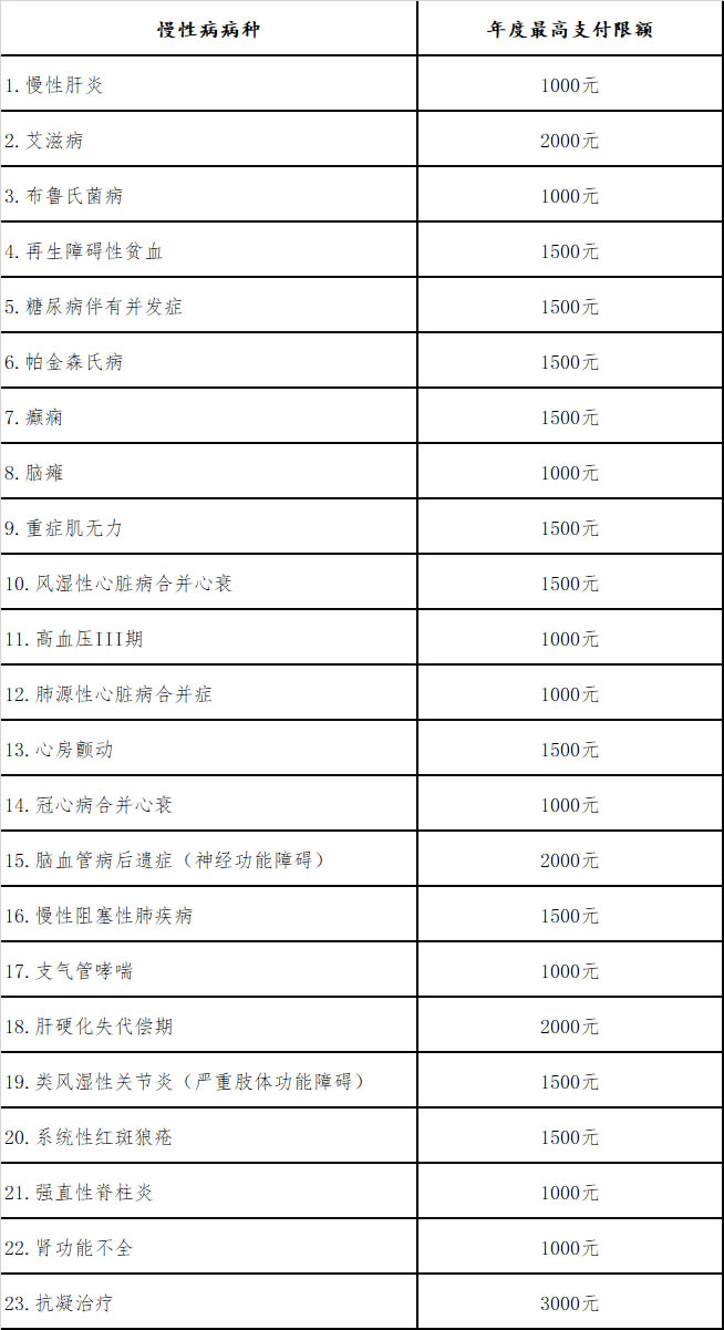 1.門診慢性病基本醫(yī)保報銷不設起付線,醫(yī)保政策范圍內合規(guī)費用統(tǒng)籌基金支付70%,年度最高支付限額見上表。