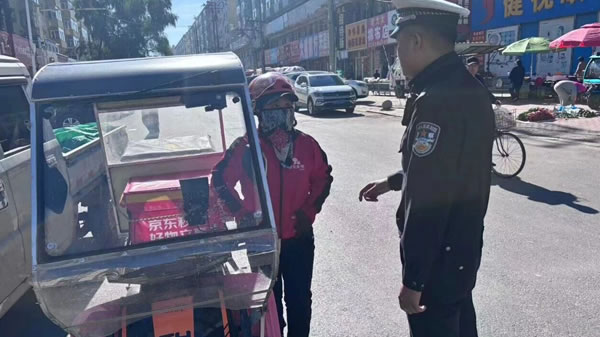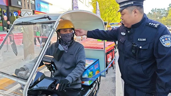 行動中,民輔警在城區(qū)電動車、摩托車通行集中路段,對摩托車、電動車逐輛進(jìn)行檢查,對未正確佩戴安全頭盔的騎乘人員,現(xiàn)場講解正確佩戴頭盔的方法及佩戴頭盔的重要性和必要性。對未佩戴安全頭盔的騎乘人員進(jìn)行教育、警告。并當(dāng)面宣講交通安全法律法規(guī)等安全知識,詳細(xì)剖析駕乘電動車、摩托車不佩戴安全頭盔的嚴(yán)重危害和后果。尤其針對外賣、快遞等配送人員,民輔警在街頭逐一檢查車輛運(yùn)行手續(xù)和安全性能、頭盔是否符合國家標(biāo)準(zhǔn)等情況,明確要求快遞配送人員必須發(fā)揮重點(diǎn)行業(yè)示范引領(lǐng)作用,時刻戴好安全頭盔,遵守交通法規(guī),做好交通安全的帶頭人。