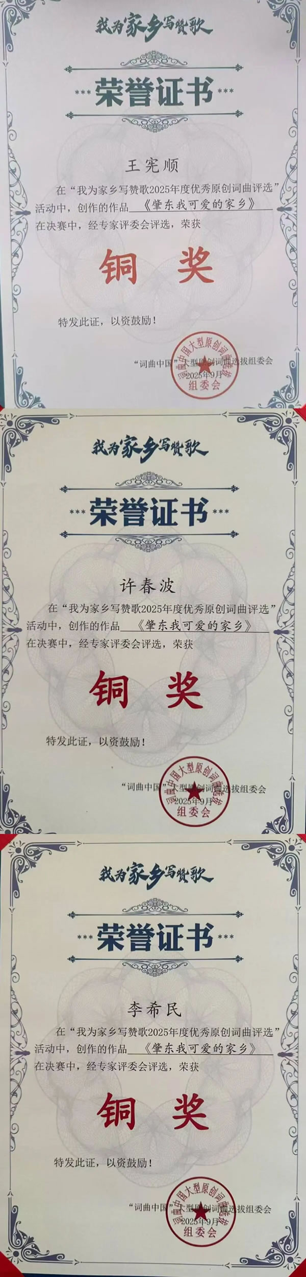 近日,“我為家鄉(xiāng)寫(xiě)贊歌2025年度優(yōu)秀原創(chuàng)詞曲評(píng)選”全國(guó)決賽落下帷幕,肇東本土創(chuàng)作團(tuán)隊(duì)交出亮眼答卷——由王憲順、許春波作詞,李希民作曲的《肇東我可愛(ài)的家鄉(xiāng)》憑借濃郁的地域風(fēng)情與動(dòng)人的情感表達(dá),成功斬獲銅獎(jiǎng)。