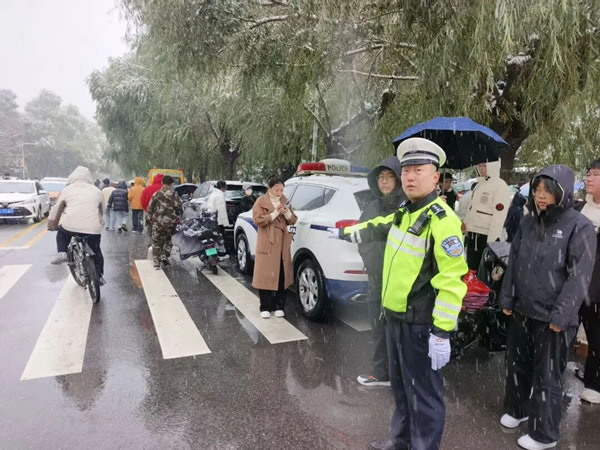 正值上學(xué)上班早高峰時段,雪勢愈發(fā)急切。路上的車流量正逐漸增大,一排排車輛披著白皚皚的雪花,司機們開啟行車燈,打開雨刮,小心翼翼地駕駛著車輛。此時,從主干道到居民區(qū)的街巷,身著制服的交警身影早已鋪開,在風(fēng)雪中織就了一張守護(hù)之網(wǎng)。在城區(qū)主要交通樞紐、小區(qū)門口、學(xué)校周邊,忙碌的交警隨處可見。雪花落在帽檐上化成水珠,順著臉頰往下淌,他們卻無暇顧及擦拭。他們的指揮手勢始終沉穩(wěn)而有力,每一次抬臂、轉(zhuǎn)向,都仿佛在風(fēng)雪中劃出了安全的坐標(biāo),給過往司機“吃下安全的定心丸”。