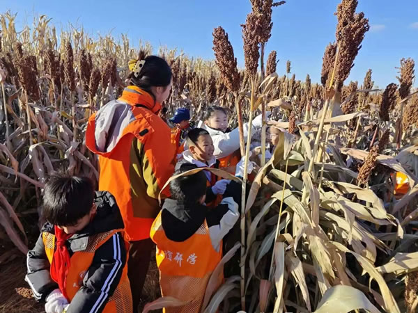 隨后,孩子們來(lái)到鶴島農(nóng)莊參與高粱收割實(shí)踐。研學(xué)導(dǎo)師詳細(xì)講解高粱的種植歷史、生長(zhǎng)周期與多元用途,讓大家全面了解糧食生產(chǎn)過(guò)程。在古法收割體驗(yàn)中,孩子們親身體會(huì) “粒粒皆辛苦” 的含義,還共同宣讀《節(jié)約宣言》,在橫幅上鄭重簽名,許下節(jié)糧承諾。