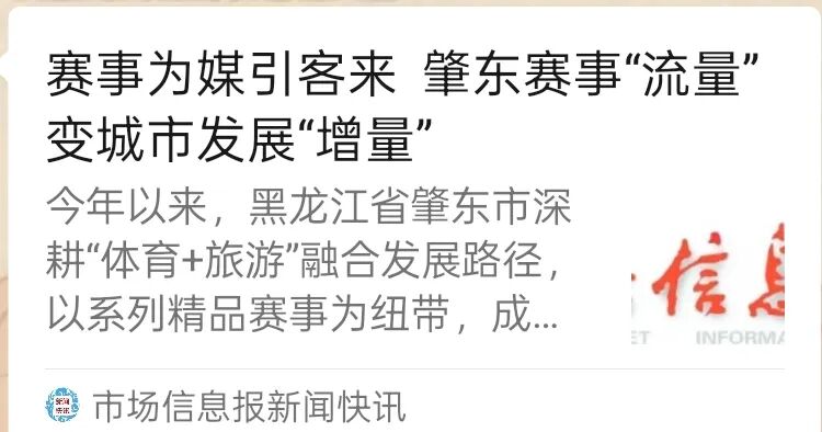 近日,肇東市以系列精品賽事為核心的文體旅融合發(fā)展模式引發(fā)多家媒體集中關(guān)注,今日頭條、騰訊新聞、搜狐新聞、百度、市場(chǎng)信息報(bào)信息快訊等多家媒體相繼聚焦其賽事經(jīng)濟(jì)成效進(jìn)行專題報(bào)道,讓肇東“以賽促游、以游興城”的發(fā)展故事成為矚目焦點(diǎn),賽事經(jīng)" />