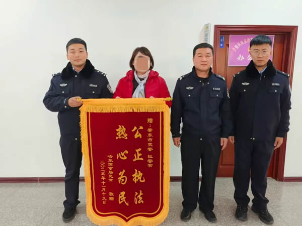 近日,哈市市民黃女士將一面鐫刻著“公正執(zhí)法、熱心為民”的錦旗送到肇東交管大隊(duì)事故中隊(duì)民警手中,由衷表達(dá)對(duì)他們的感謝之情。