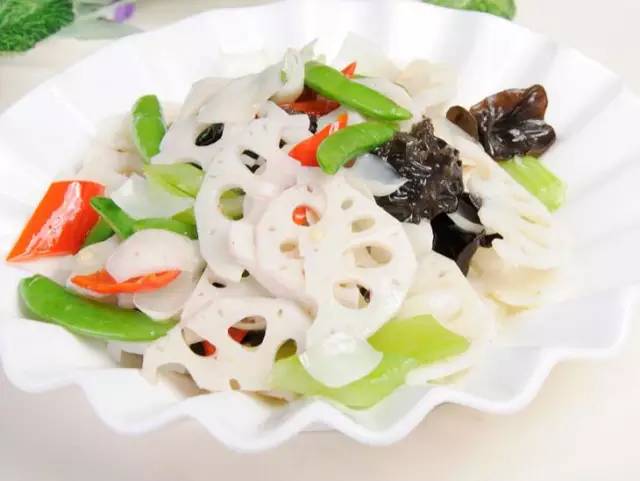 做法:藕、胡蘿卜、木耳、荷蘭豆分別泡發(fā)、洗凈、去皮,分別切片。嫩嫩的荷蘭豆,去掉兩端,不必再切。藕切了泡在滴了白醋的水里,更顯得白凈如玉。分別焯水,藕片待水一滾,微微透了明就好了,別焯過,焯好還要放進涼水里。荷蘭豆和胡蘿卜片稍稍多焯一會兒。鍋內入油,煸香蔥花,先加入荷蘭豆和胡蘿卜片煸炒,再加木耳和藕片,加適量鹽調味就好了。