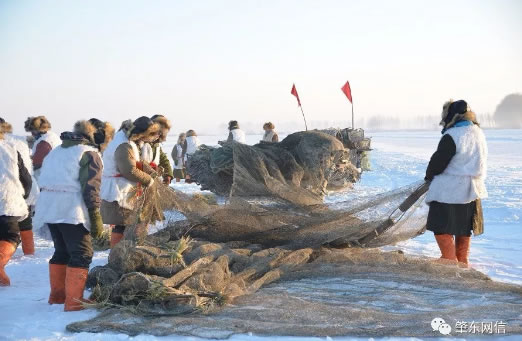 大似海有個古老的蒙古名,叫烏珠古爾泊,意為最南端尖狀湖。大似海曾經(jīng)是郭爾羅斯先民游牧封地,當時的漁民用魚叉、魚鉤和魚亮子等工具捕魚。勤勞智慧的東北漁民不斷發(fā)明創(chuàng)造,逐步演變成今天這種多片連接的巨型冬網(wǎng),長期實踐活動形成了一整套的冬捕技巧和特有的祭祀風俗,蘊含和散發(fā)出古老漁獵文化的非凡魅力。冬捕對于當?shù)氐木用駚碚f,不僅僅是捕魚也是一種獨特的生活方式,寄托著他們的歡樂以及對美好生活的向往和希望。