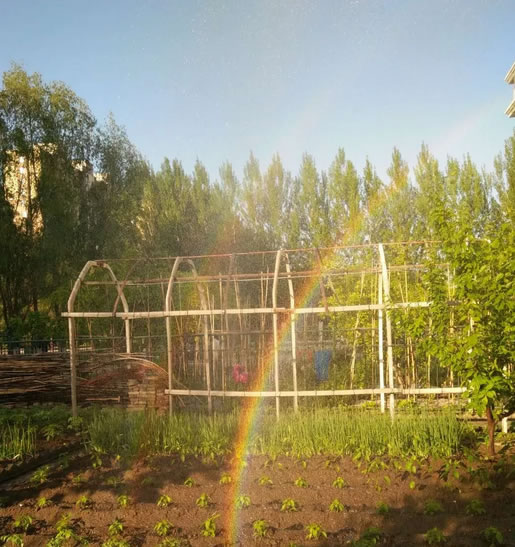 滕立坤是菜園主人,退休后以侍弄樓前5分小菜園為樂(lè)趣。由于連日高溫干旱,5月30日6時(shí)許,他在自家水井上按泵通電,將水管連接起噴頭綁在竹竿子上,在菜園子的上空高高豎起,開始噴水澆園抗旱,出乎預(yù)料的是在陽(yáng)光的照射下,水霧中驚奇般的出現(xiàn)了一道亮麗的風(fēng)景線。我趕緊用手機(jī)記錄下了那精彩的瞬間,吸引了數(shù)十名晨練的人們駐足觀看。
