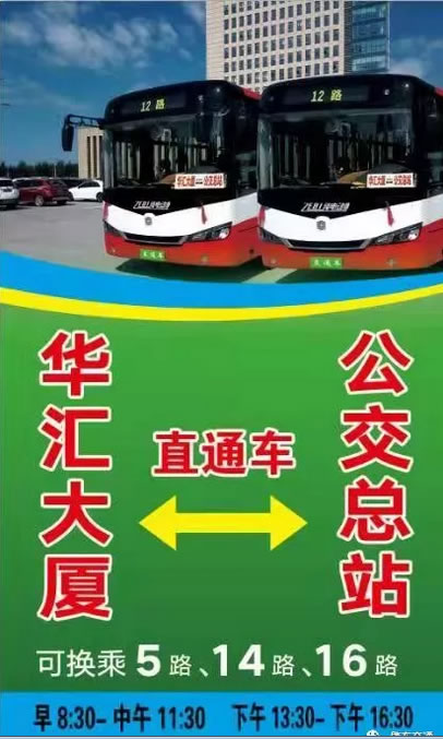 班車運行時間為早8點至11點、下午1點至4點,由紫都花園小區(qū)正門北發(fā)車,途徑生態(tài)園林南路,直達華匯大廈。城鄉(xiāng)居民可乘坐5路、14路、16路公交車抵達公交總站后,換乘12路“直通車”。