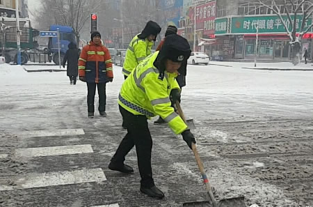 城區(qū),交警堅(jiān)守崗位,加大指揮疏導(dǎo)力度,及時(shí)救助行人和受困車輛,維護(hù)正常道路交通秩序。在人民小學(xué)和肇東火車站,城鎮(zhèn)一中隊(duì)中隊(duì)長(zhǎng)張曉偉帶領(lǐng)隊(duì)員,與環(huán)衛(wèi)部門一同清理道路積雪,方便車輛和行人通行。